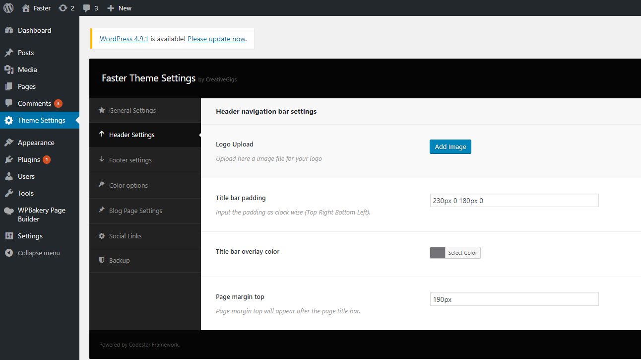 After installing the theme you most have to install the ‘Faster Core’, ‘Visual composer’ and ‘Codestar Framework’ plugins to import the demo content as well and work the theme correctly.